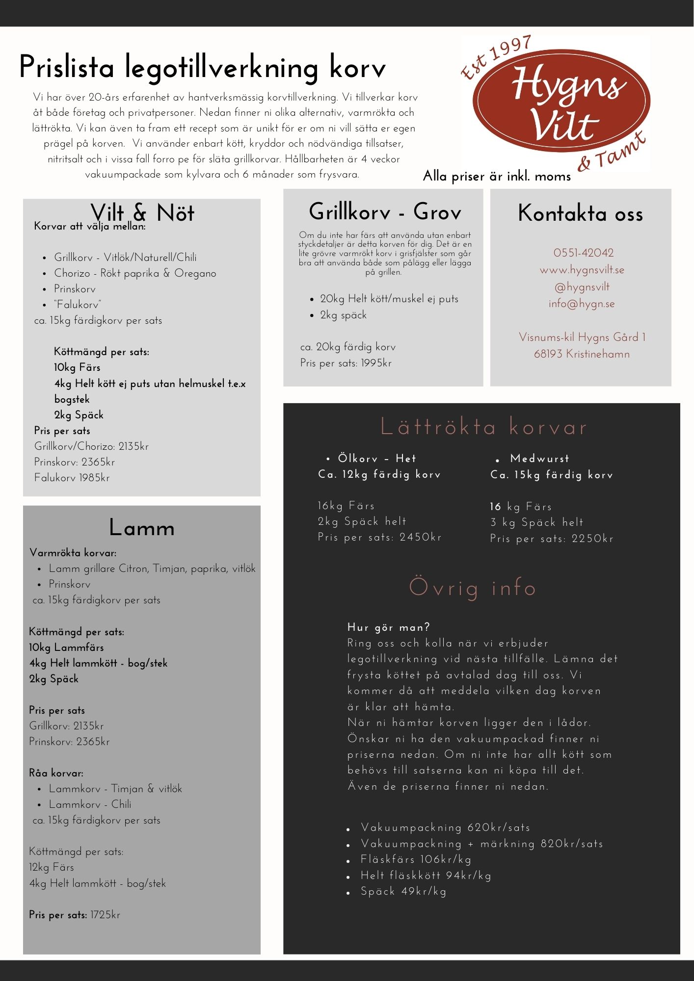 Vi har över 20-års erfarenhet av hantverksmässig korvtillverkning. Vi tillverkar korv åt både företag och privatpersoner. Nedan finner ni olika alternativ, varmrökta och lättrökta/lufttorkade. Vi kan även ta fram ett recept som är unikt för er om ni vill sätta er egen prägel på korven. Vi använder enbart kött, kryddor och nödvändiga tillsatser, nitritsalt och i vissa fall forro pe för släta grillkorvar. Vi erbjuder även alternativ utan nitritsalt om djuren har slakats på Hygns slakteri.